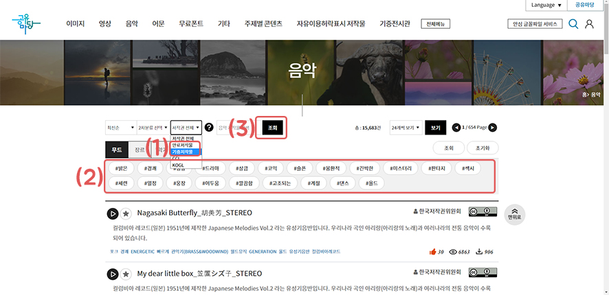 (1) 둘 중 "기증저작권, 만료 저작물" 상업적으로 사용가능 한 무료음원, 배경음악(배경음악)을 선택하여 사용합니다