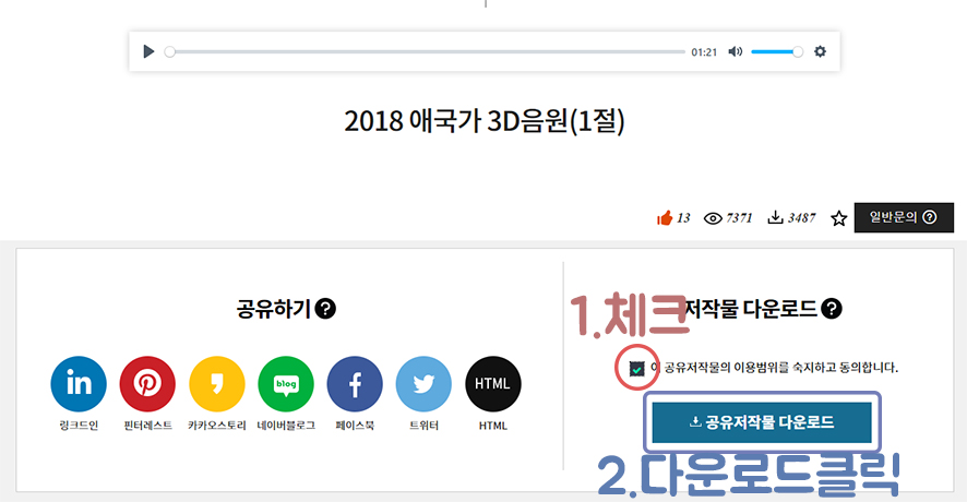 3. "이 공유 저작물으 이용범위를 숙지하고 동의합니다" 체크 후 공유 저작물 다운로드를 클릭하여 받으시면 됩니다