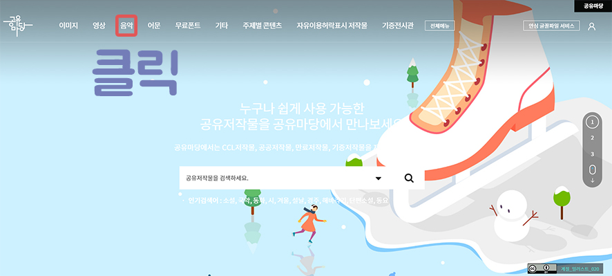 1. 메인 페이지에서 "음악" 메뉴 클릭을 하면 아래 페이지가 나옵니다