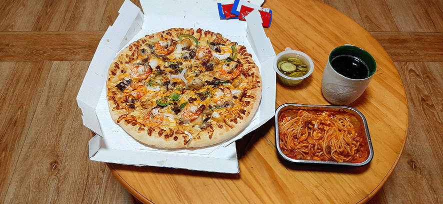 도미노 피자 블랙타이거슈프림L + 치즈볼로네즈 스파게티 + 콜라 1.25L