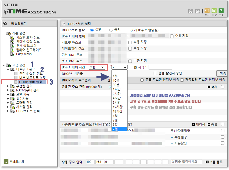 3. IP 주소 대여 시간 설정을 제일 긴 7일로 설정을 하고 적용을 누릅니다