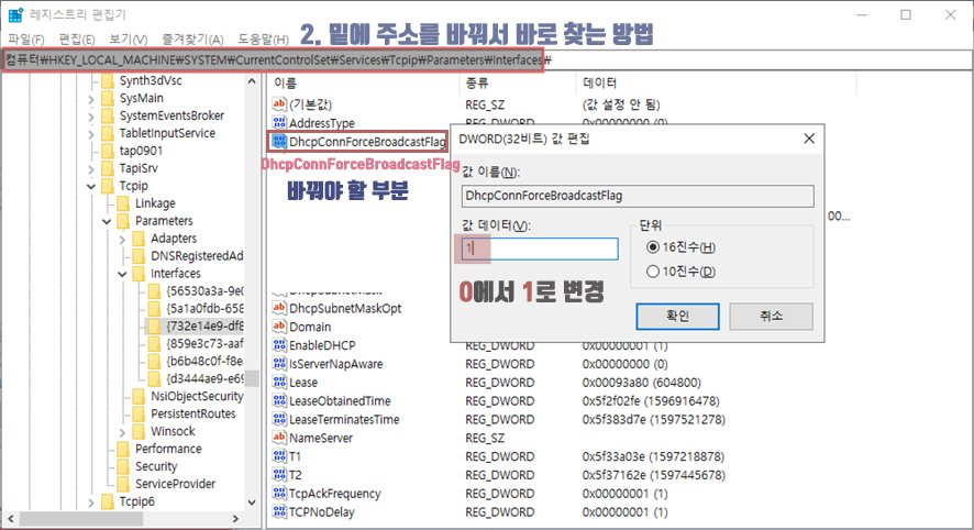5. DhcpConnForceBroadcastFlag : 0에서 1로 변경