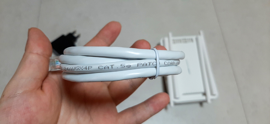 상자에는 1m 길이의 LAN 케이블이 포함되어 있습니다. CAT .5e는 케이블에 기록되어 있기 때문에 Giga LAN을 지원합니다. (cat.5e에서 지원하지만 1GB 이상의 속도를 얻으면 cat6 이상을 사용하는 것이 좋습니다)