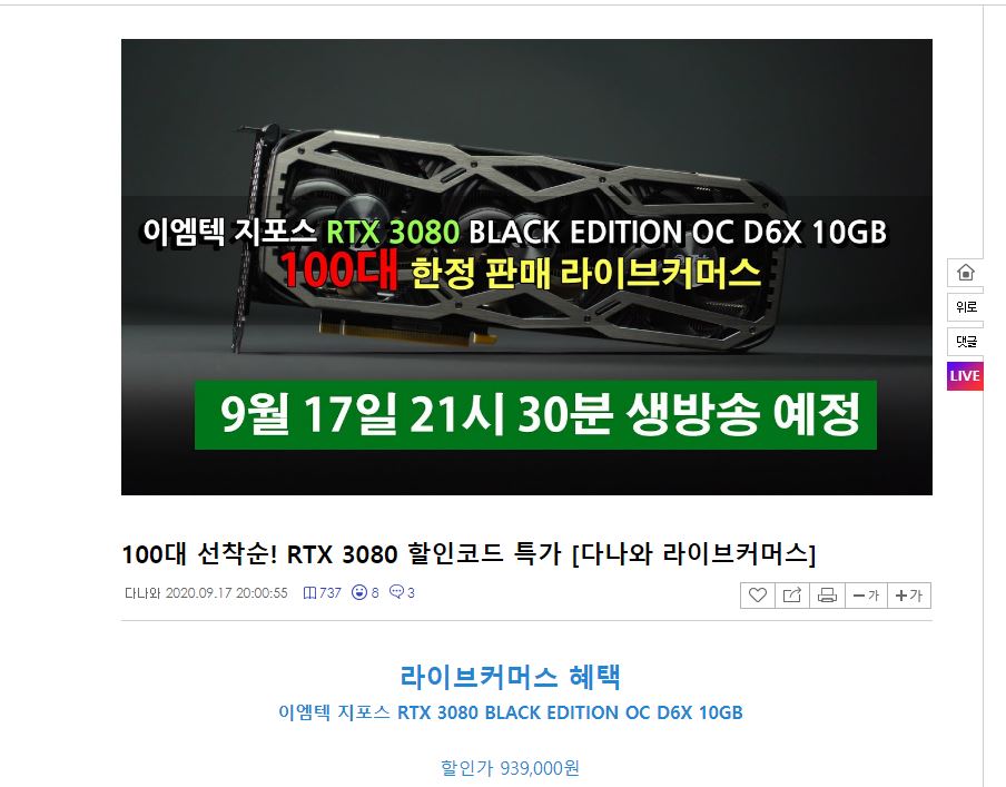100대 선착순! RTX 3080 할인코드 특가 [다나와 라이브커머스]