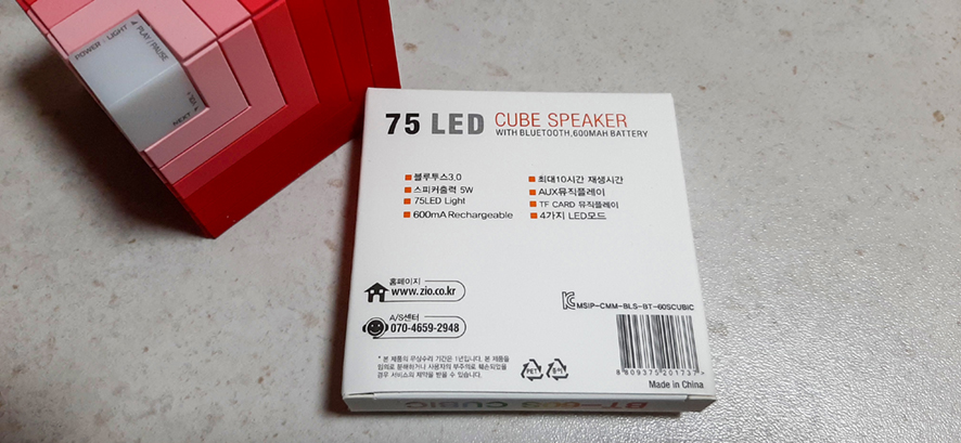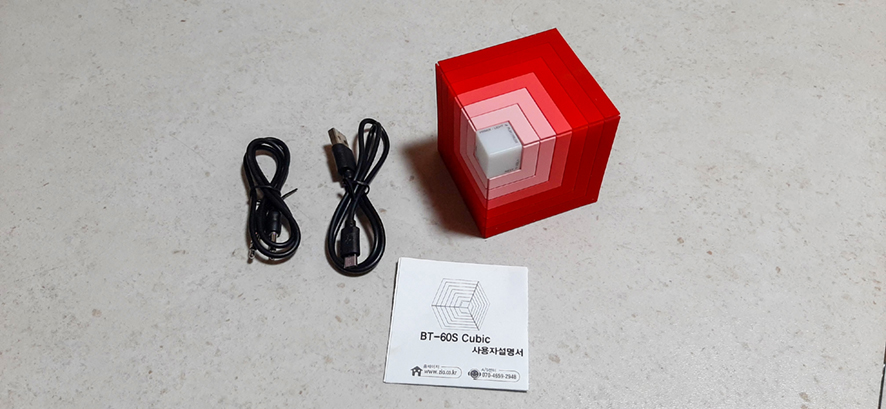 (본체 Bless Zio BT-60S CUBIC, 오디오 단자에 연결된 AUX IN 케이블, 마이크로 5 핀 USB 충전 케이블, 매뉴얼)
