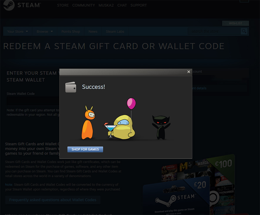 Steam Wallet Note: We have made some changes to how Steam Wallet Codes are redeemed on Steam, as part of our ongoing effort to reduce scams like the ones explained HERE. These changes should not impact regular customers who enjoy using Steam wallet codes t