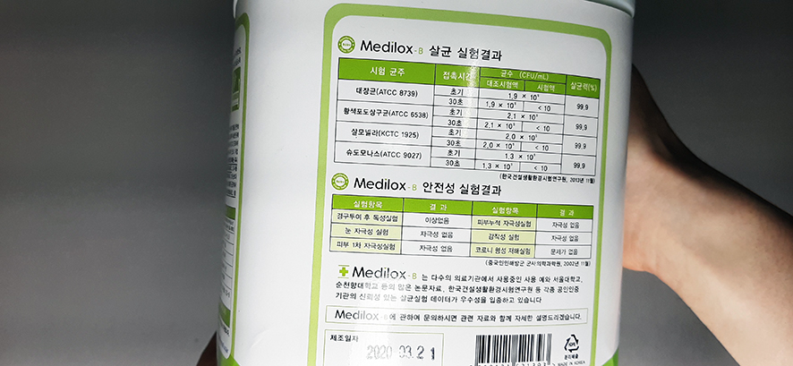 | 일반 락스처럼 냄세가 심하지 않습니다. 추가내용 ![]() 코로나가 터진 후 구입했던 살균 소독제 메디록스 B 코로나 초반에 소독제를 찾아 주문한 것이라 소독이 되는지는 전문가가 아니다 보니 조금이나마 도움이 될까 구입했던 살균 소독제 였습니다. |