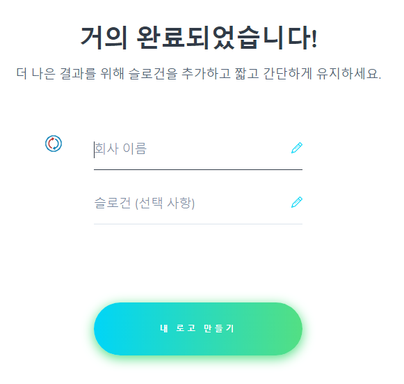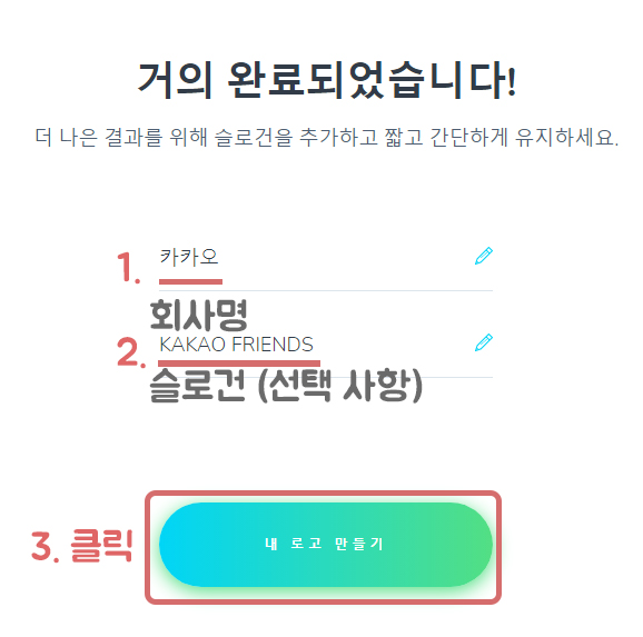회사 이름과 밑에 선택 사항은 선택적 기입, 1,2 번을 적으셨다면 3번 클릭으로 로고를 생성합니다