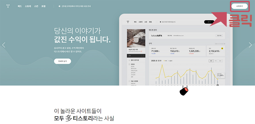 2. 티스토리 첫 화면에서 오른쪽 최상단에 있는 '시작하기' 를 클릭하여 로그인을 진행 합니다