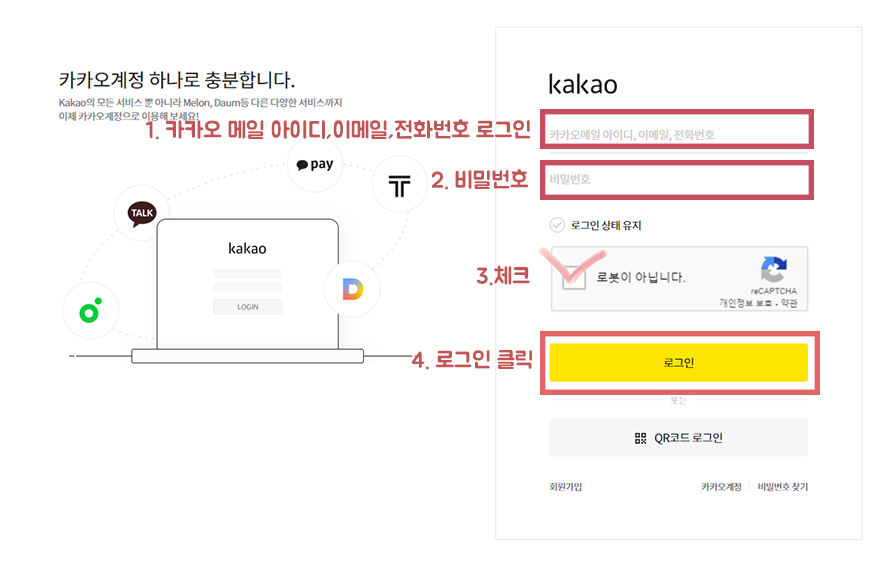 (1) 카카오메일 아이디, 이메일, 전화번호 중 자신의 아이디를 입력합니다 (2) 비밀번호를 입력합니다 (3) 체크 (4) 로그인 클릭 |