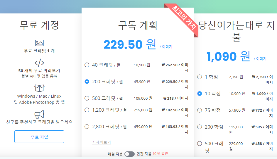 매달 무료로 플러그인을 작은 크기 0.25 메가 픽셀을 이용할 수 있고 매달 50개를 무료로 이용할 수 있습니다