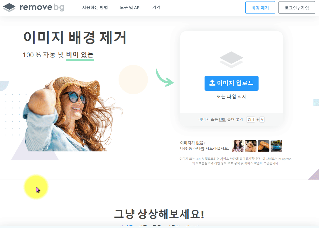 사이트 접속하여 이미지 배경을 지울 이미지를 드래그해서 올려놓거나 선택합니다