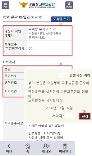 정부에서 운행하는 교통민원 24에서 1년에 쌓이는 착한 운전 마일리지 10점으로 교통법규를 못 지킨 벌점을