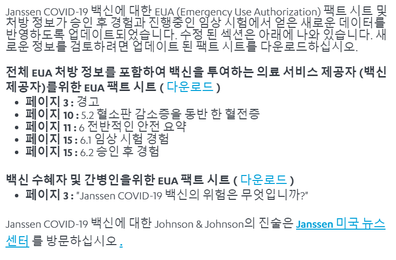 그 외에 얀센 홈페이지에서는 의료자와 일반인의 두가지로 나뉘어 주의사항 Fact Sheet 를 통해서 더 자세한 정보를 확인할 수 있습니다.