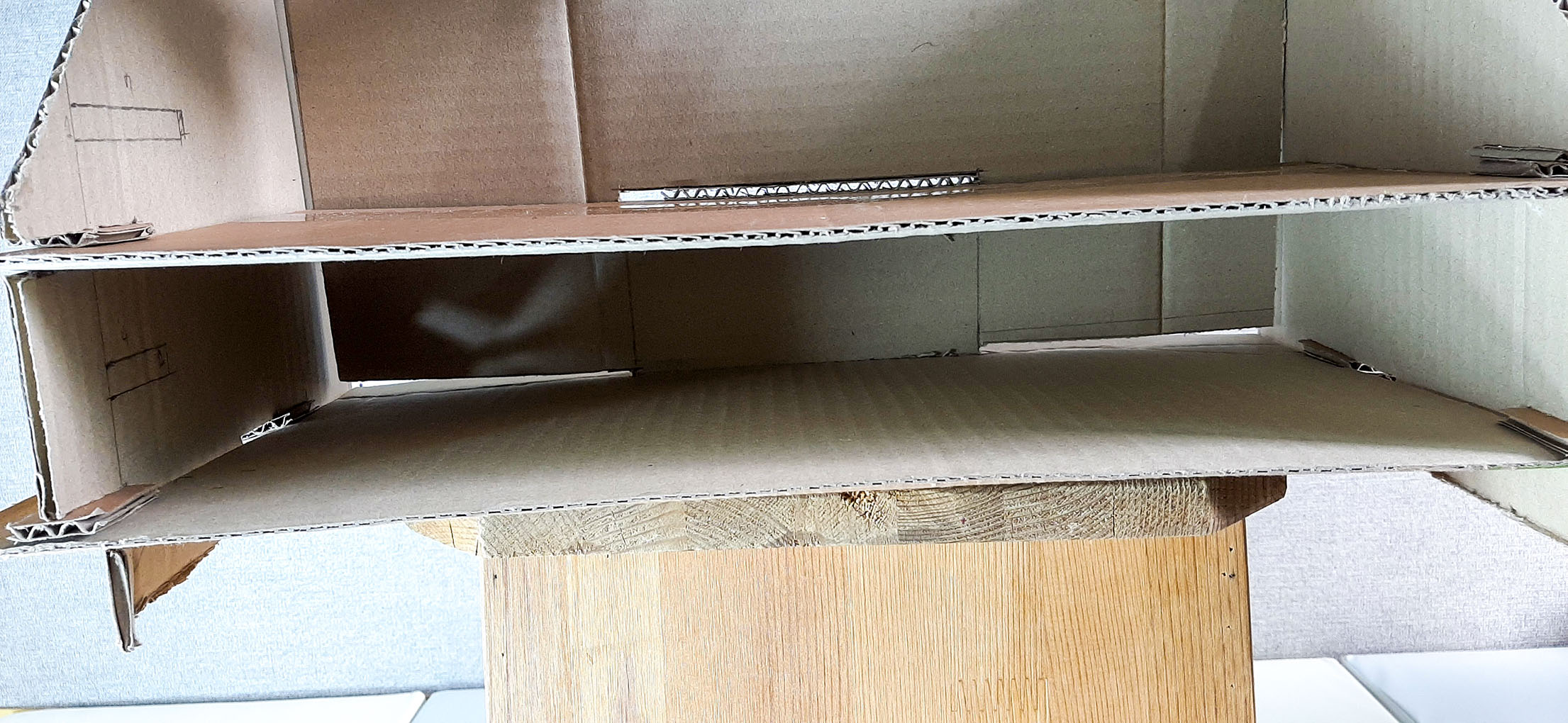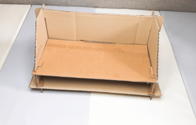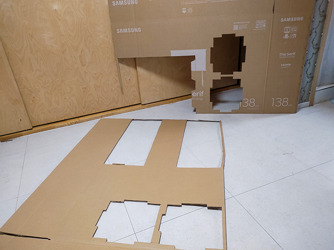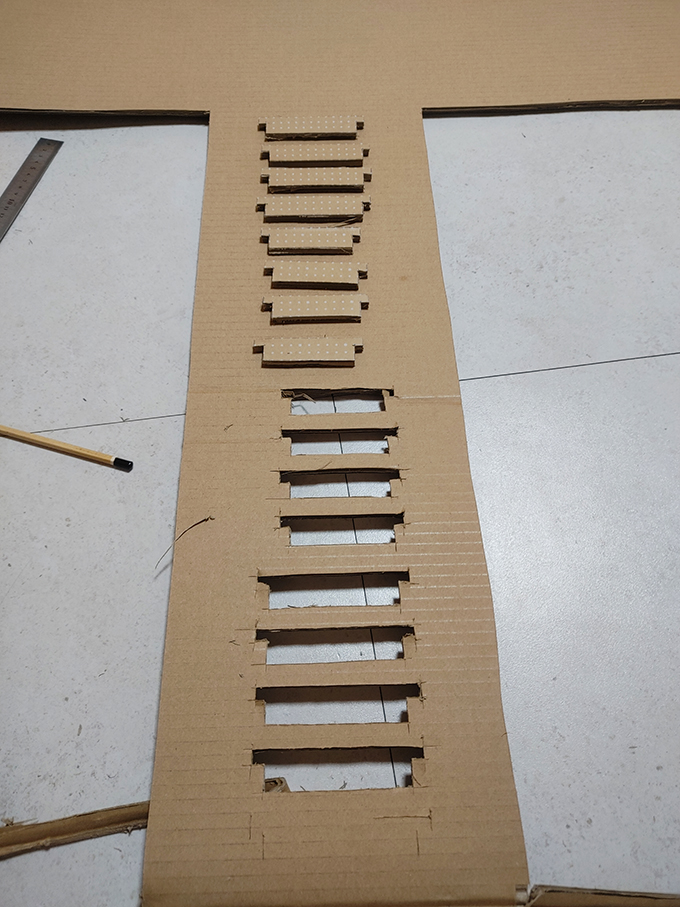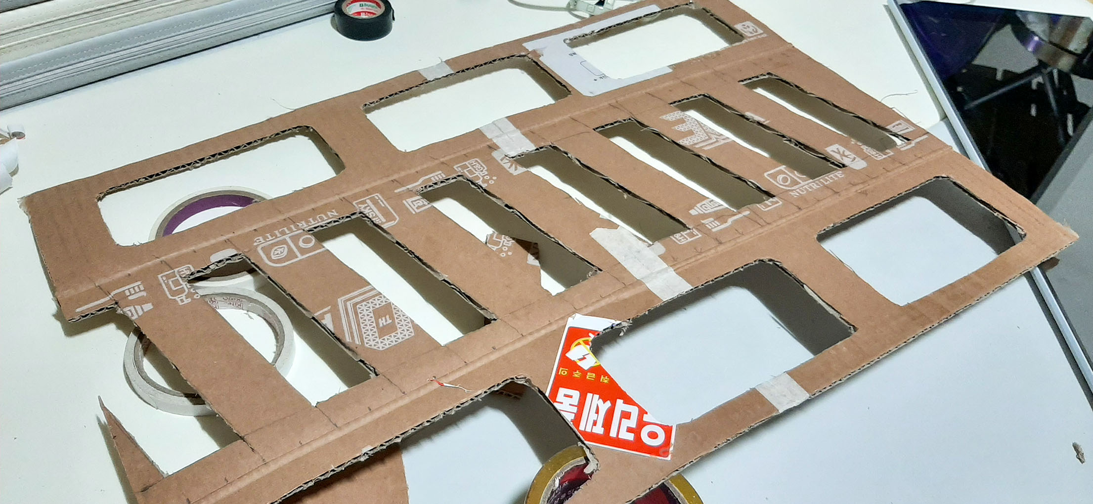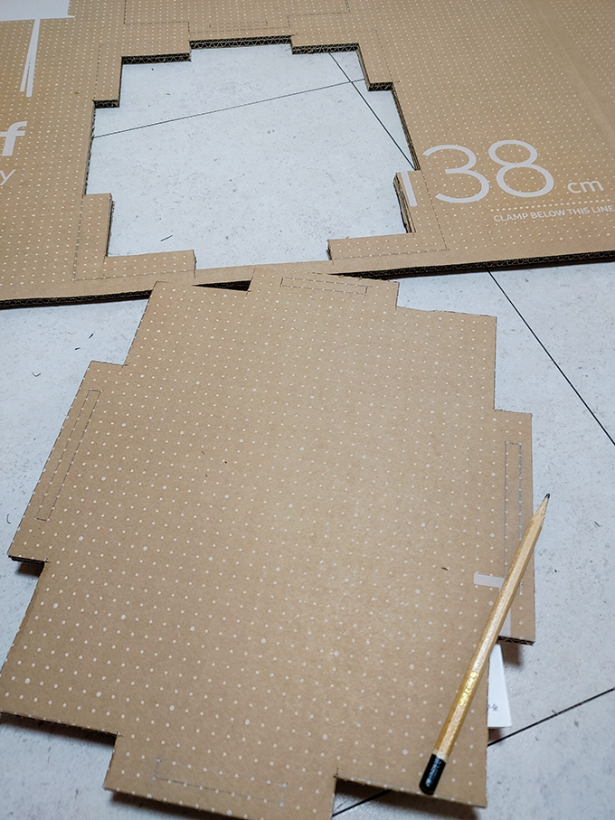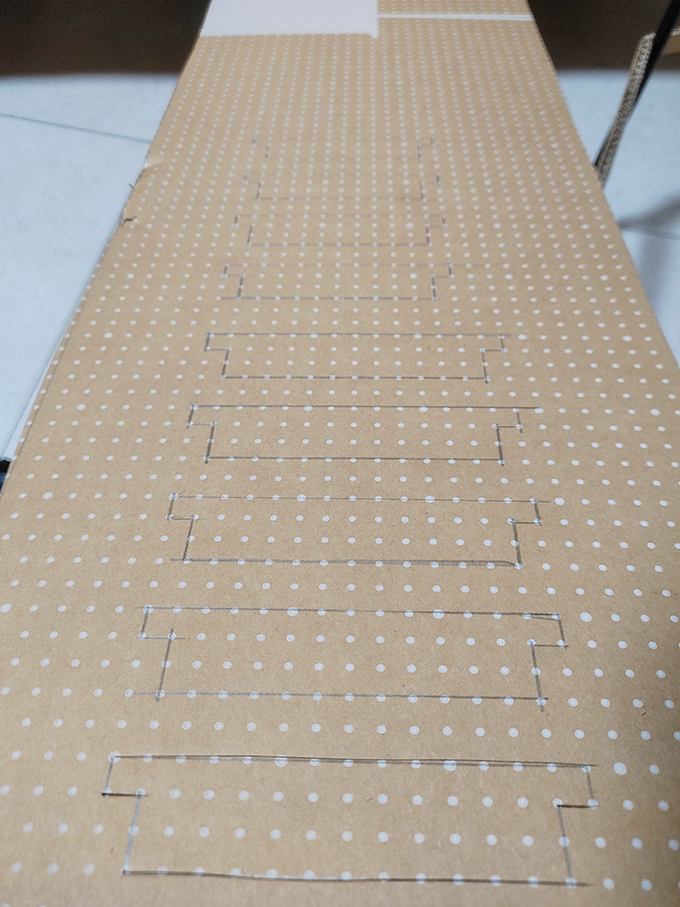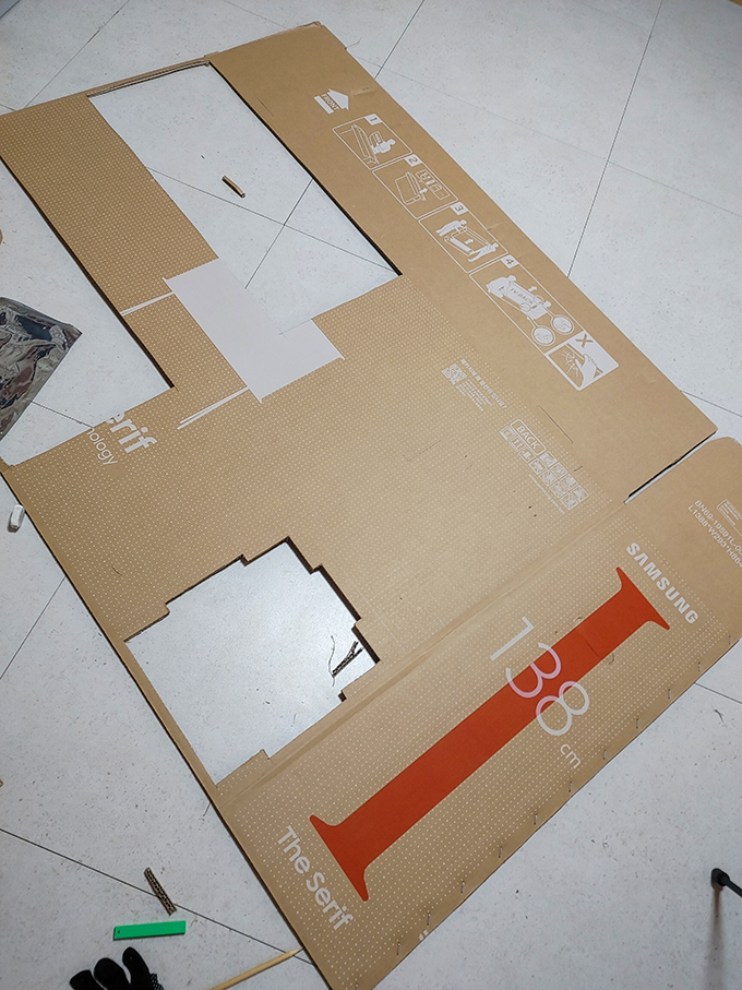 이중으로 처리된 박스라 일반 1면 일반 골판지와는 두께 차이 때문에 넓게 자를 필요가 없었다는 뒤늦게 알아버렸습니다. 박스의 두께에 따라 0.4~0.5mm의 크기를 오려 만들면 잘 맞을 것 같습니다.