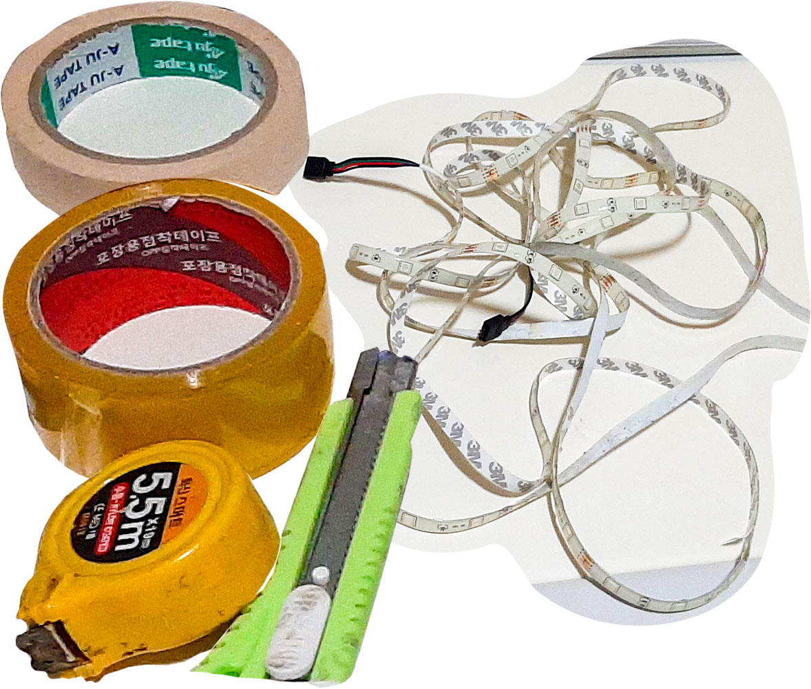 역시 필수인 칼, 자, 연필 알리에서 저렴하게 구입했던 led 모듈 (모바일 앱 블루투스 연동 가능), 알루미늄, 테이프, 창호지