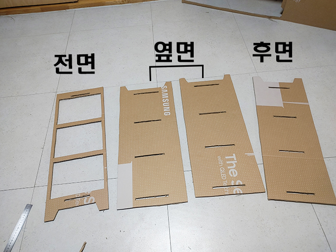 삼성 홈페이지에서는 센티미터 단위로 도면이 그려져 있는데 조립 박스와 연결되는 부분에는 박스의 두께 차이 때문에 1센티미터로 할 필요는 없었습니다. 1중으로 된 양면 골판지에는 0.4~0.5mm 사이즈로 맞추면 됩니다.