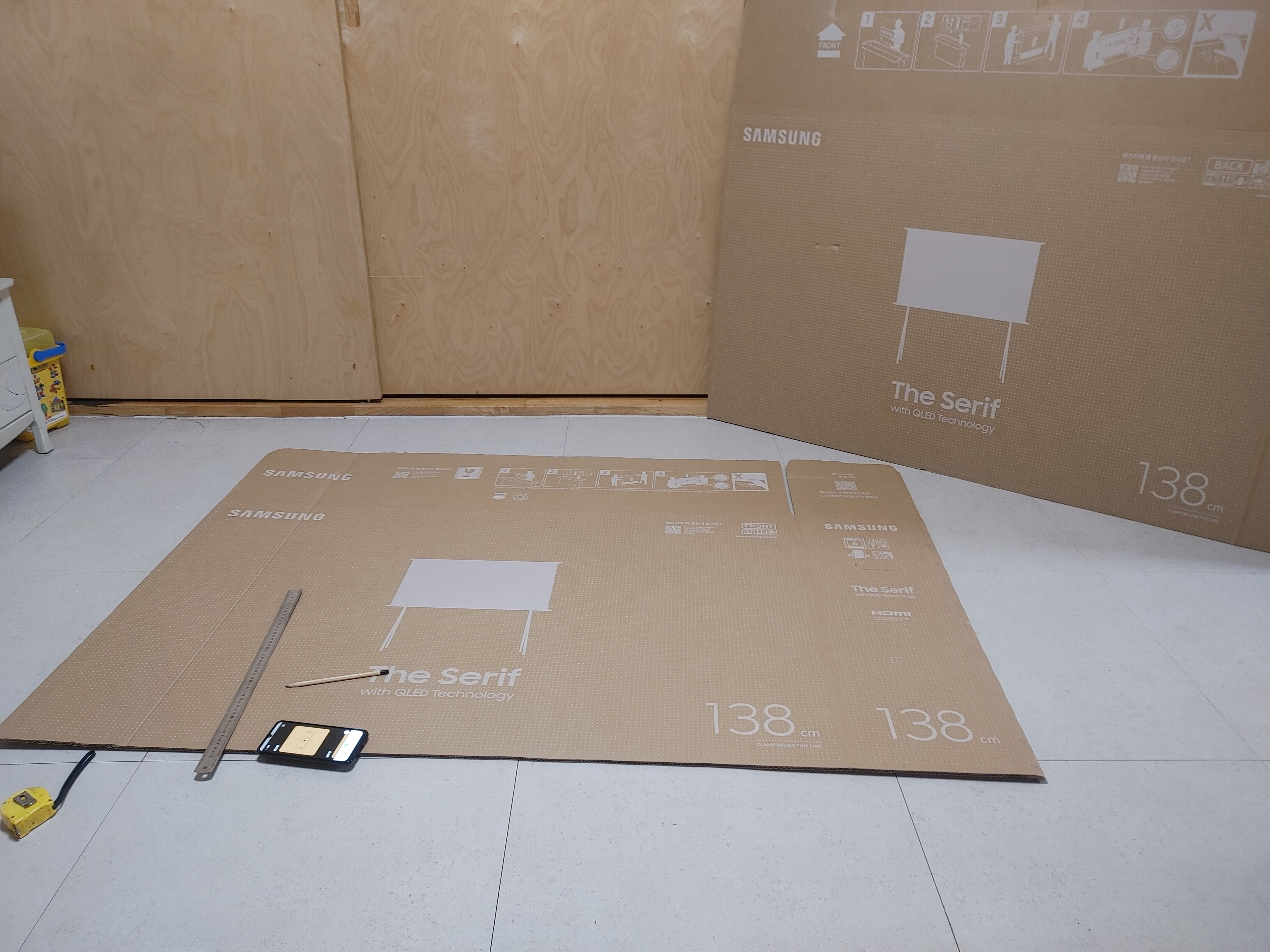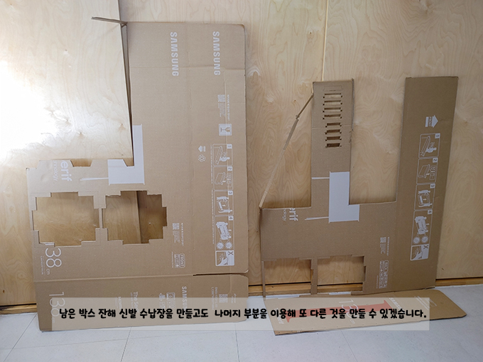 버리게 되었는데 삼성 박스는 일반 택배 박스로 흐물거리는 1중 양면 골판지와는 달리 튼튼한 2중 양면 골판지여서 보다 튼튼하고 신발장 옆에 놔둬보면 잘 어울려 환경을 생각하여 무너질 때 까지 사용해 보려고 합니다.