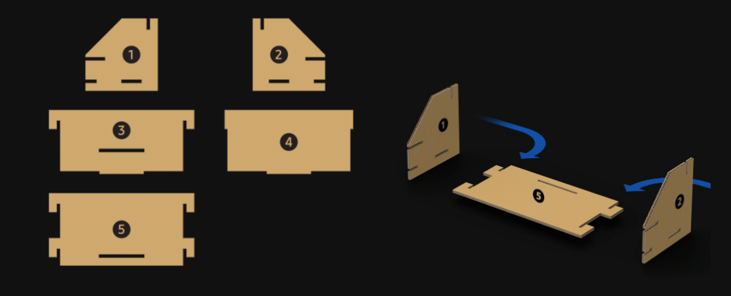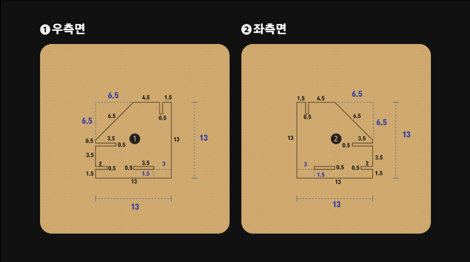 이렇게 다 만들어진 전면, 후면, 옆면 2, 상단, 하단, 중간 2, 쐐기 8개로 조립을 시작하면 됩니다.