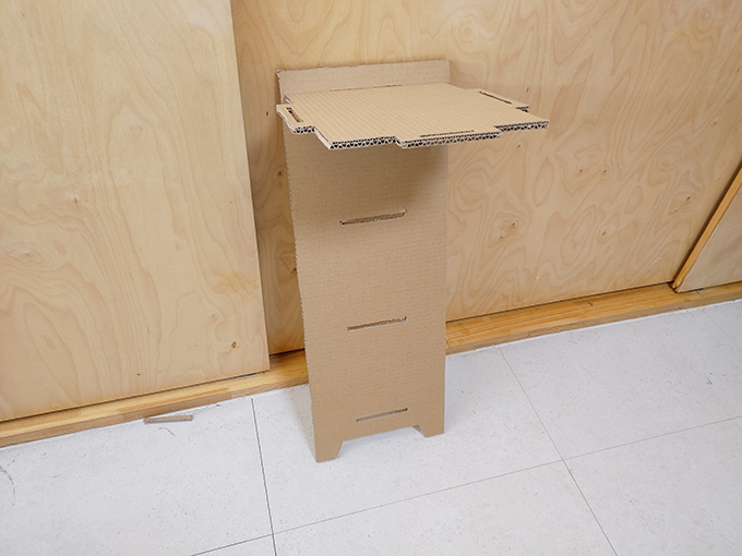 짧게 만들었다면 거뜬히 버텨 주었을텐데 1중으로 된 양면 골판지는 넓은 선반으로 만든 무게를 1kg의 무게를 견디기 힘들어합니다.