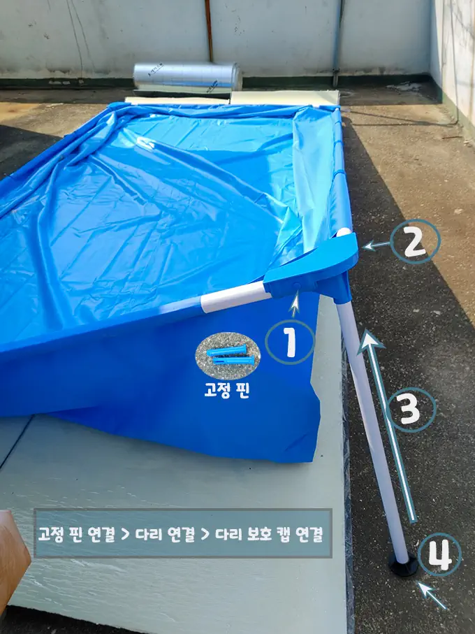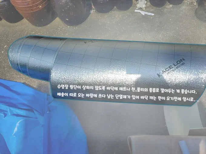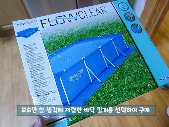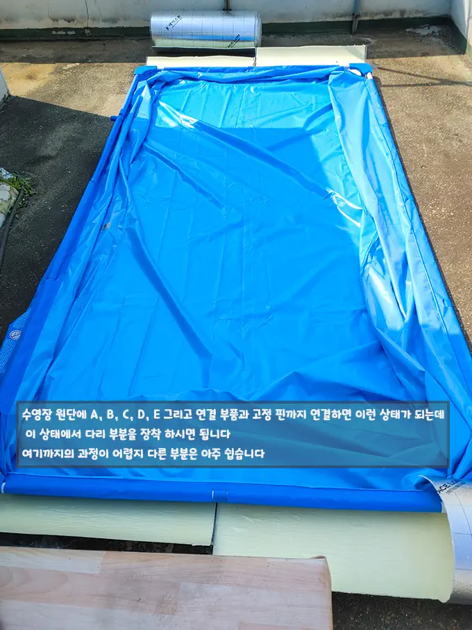 하필이면 배송이 따로와 수영장 바닥 깔개가 같이 도착하지 않아 수영장 바닥에 상처만 안도록 임시방편으로 건축 자재인 단열재로 사용하였습니다.