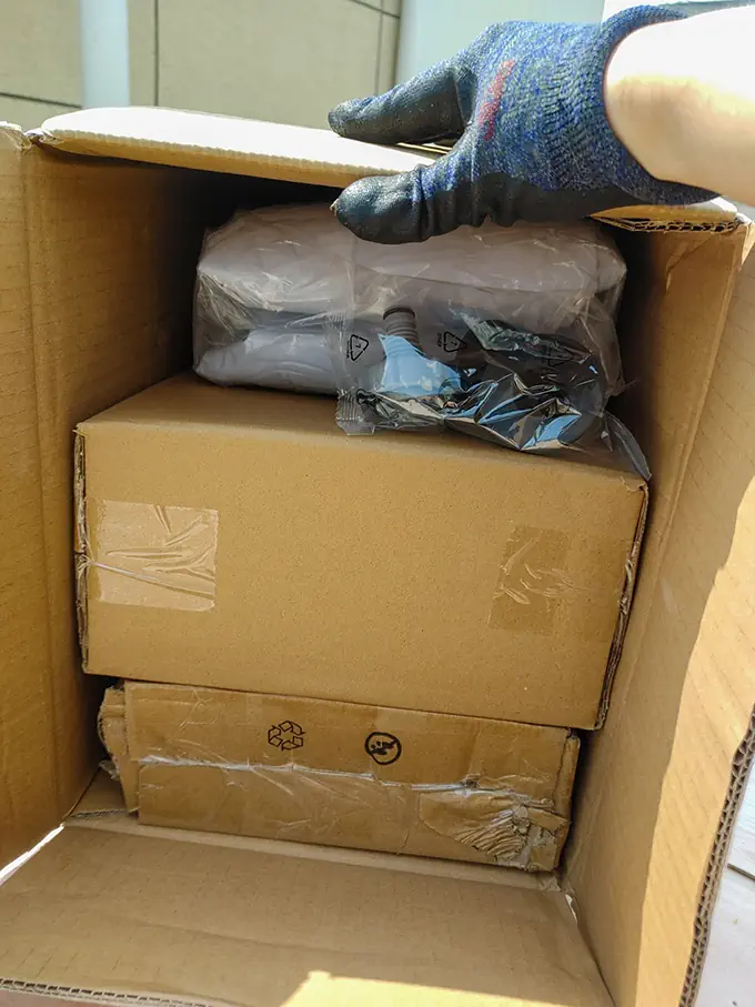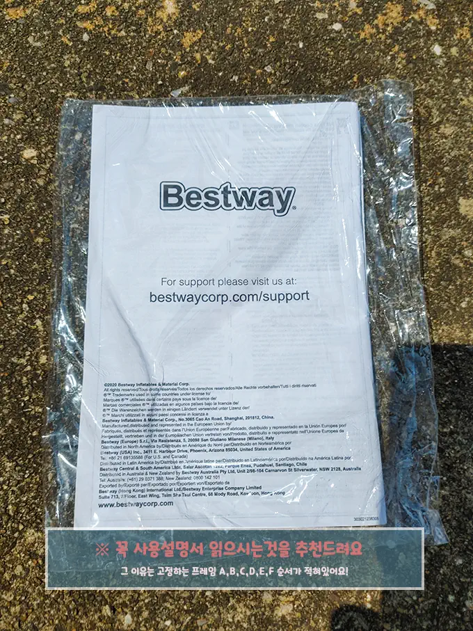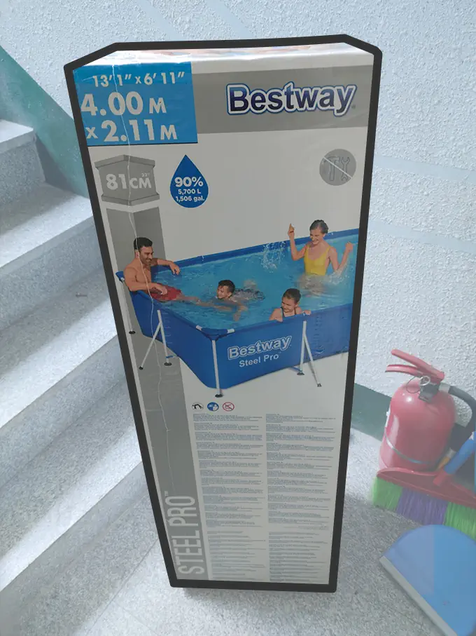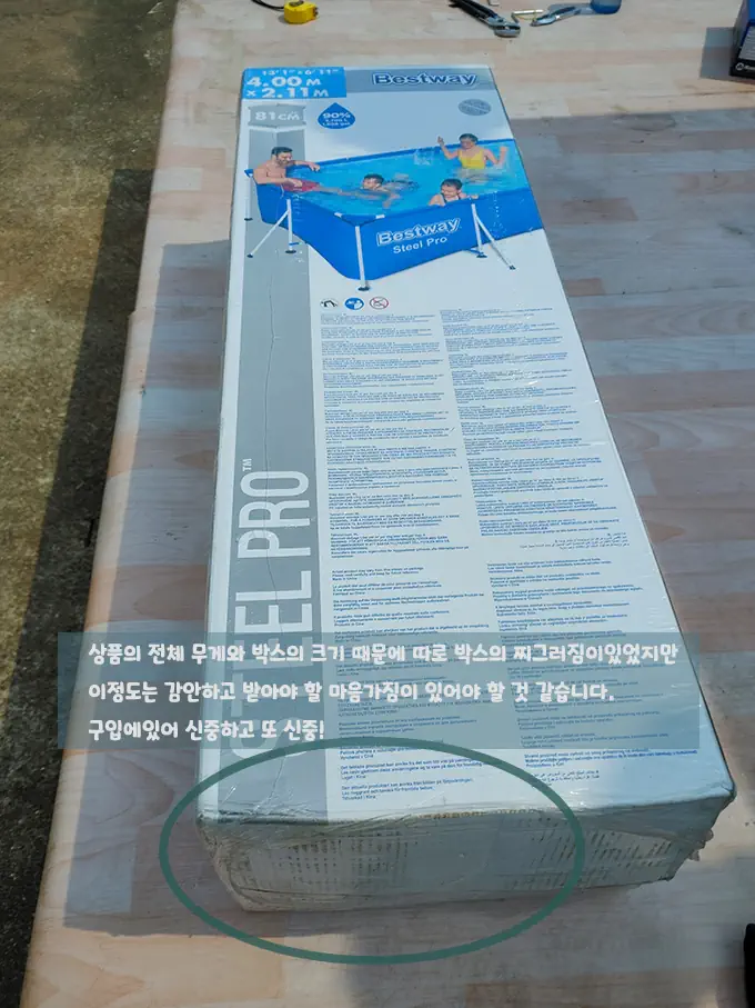 ※ 박스 개봉하기 전 칼이나 날카로운 것을 깊게 찔러 넣어 개봉하지 말아 주세요. 수영장의 원단이 그대로 노출되고 있어 찢어질 수 있습니다.