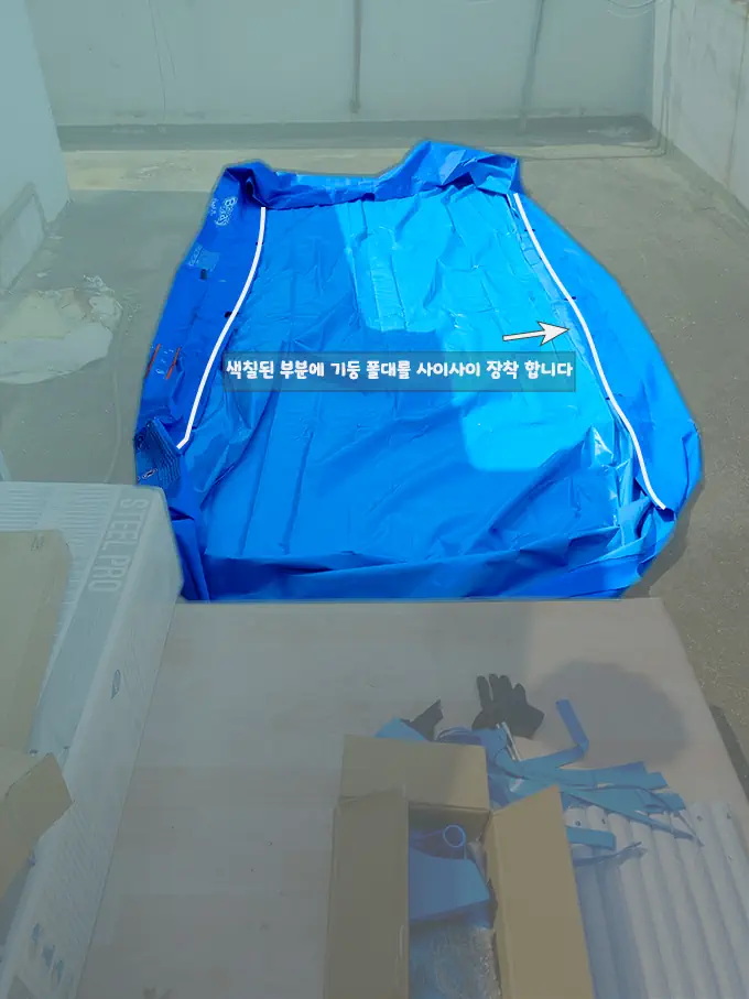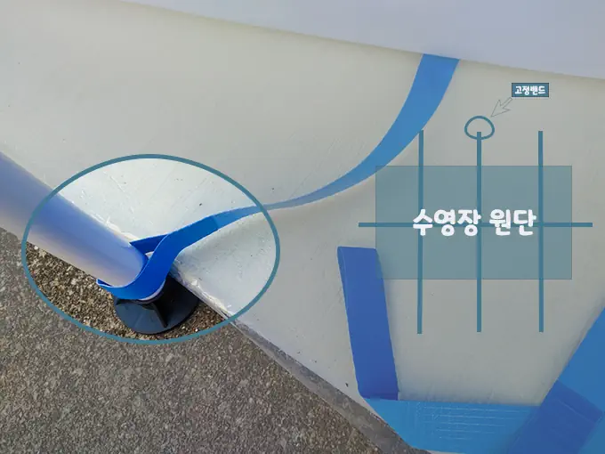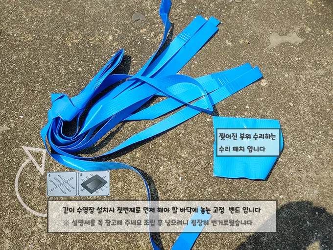 첫 번째로 설치에 앞서 바닥 고정밴드를 깔고 위에 수영장 원단을 올려놓고 진행합니다.