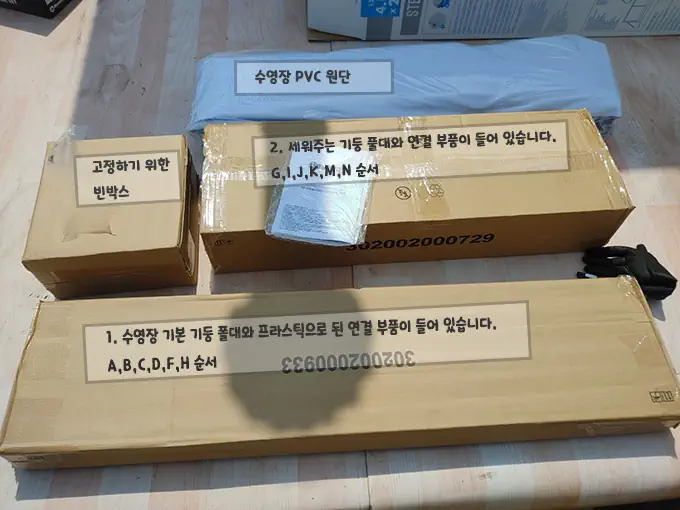 이미지 박스에 대한 설명과 같이 총 3박스와 수영장 원단 1개가 들어 있습니다.