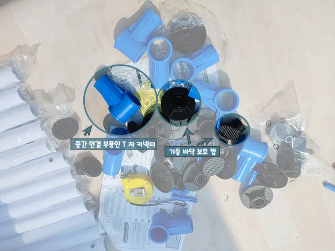 다양한 폴대와 연결 부품 그리고 다리 보호 캡입니다.