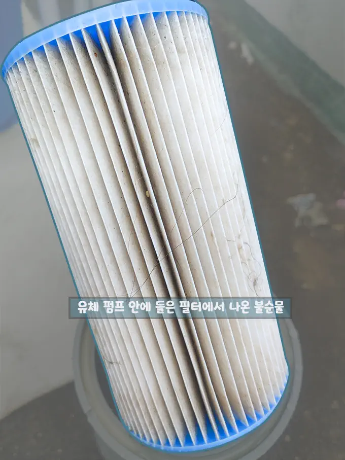 여과기 안에 들은 필터에서 이전보다 훨씬 많이 이물질이 묻어 나왔습니다.