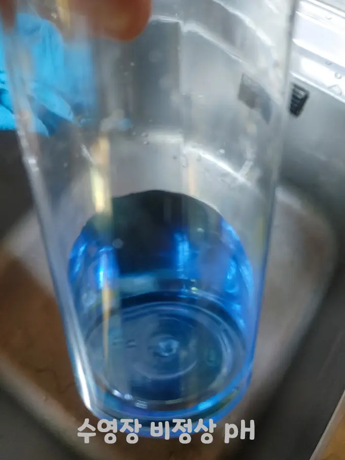 막 받은 수돗물 ph 검사 결과 정상과 파랗게 물든 간이 수영장 사용 후 ph 검사 결과