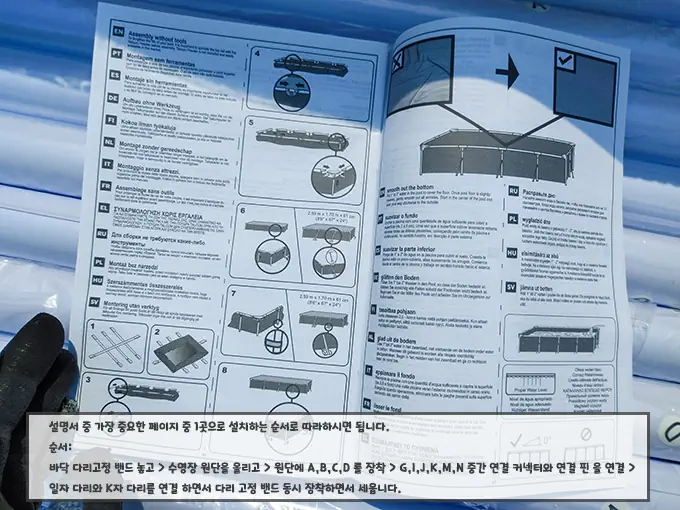 조립하는 순서에 폴대 수영장의 크기를 고정해 줄 A, B, C, D, E 그리고 높이를 담당하는 G, I, J, K, M, N 등