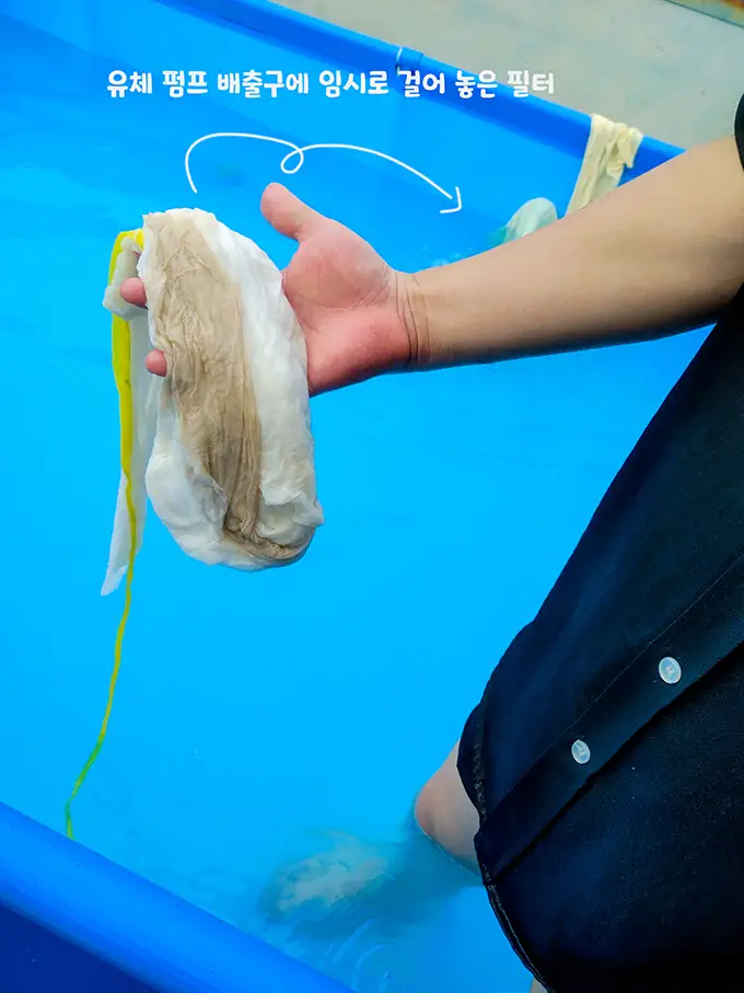 여과기를 4시간 가동시킨 뒤 필터를 한번 청소했습니다.