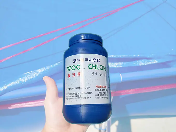 소독 염소제 : 각정 박테리아 등을 사멸시킵니다. 수영장의 세균들의 번식력을 억제시킵니다.