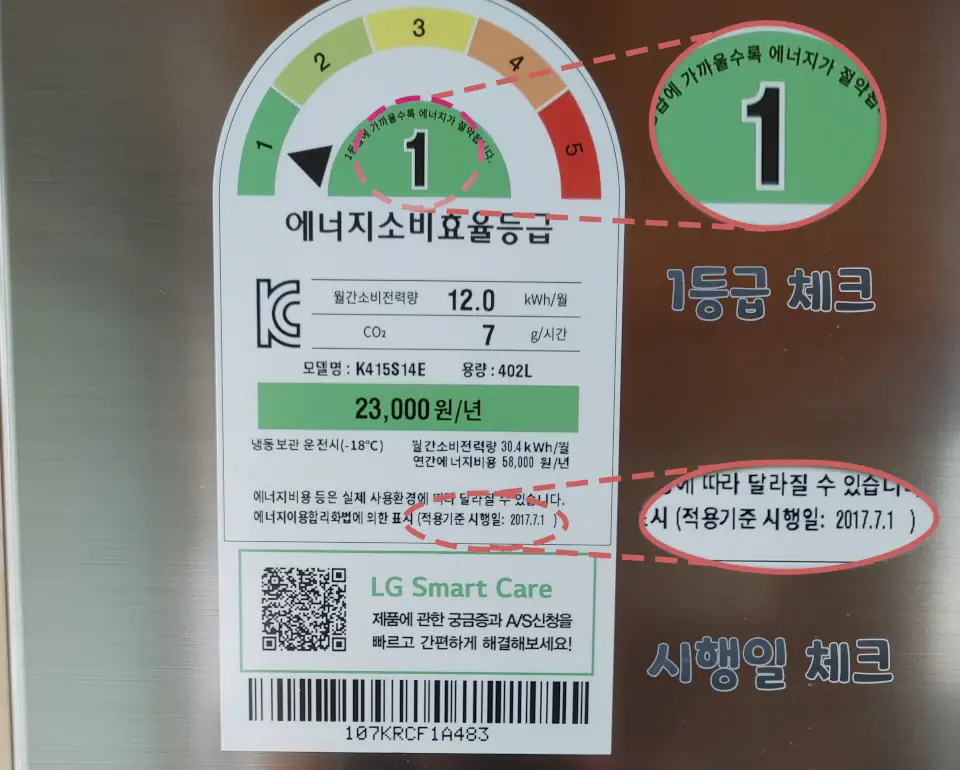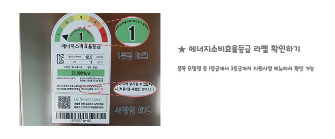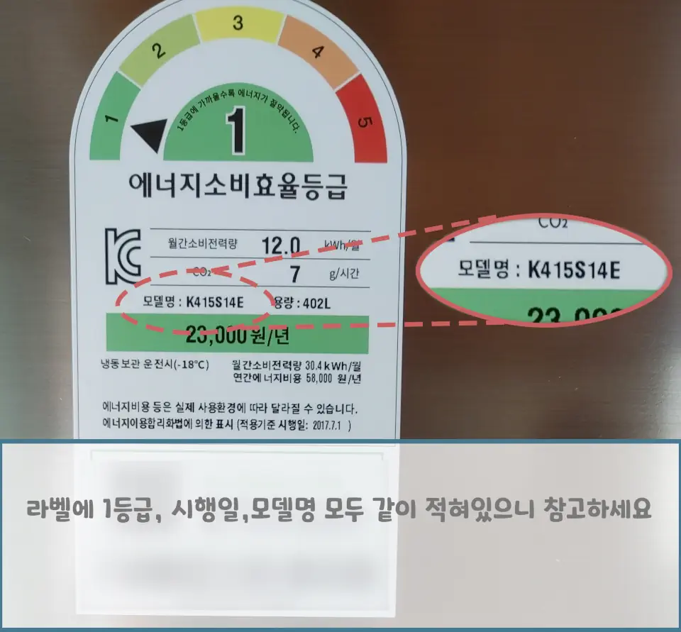 ※ 모델명도 에너지효율등급 라벨에 1등급, 시행일과 같이 적혀있으니 참고하세요