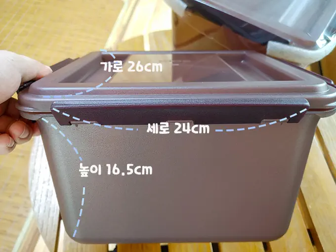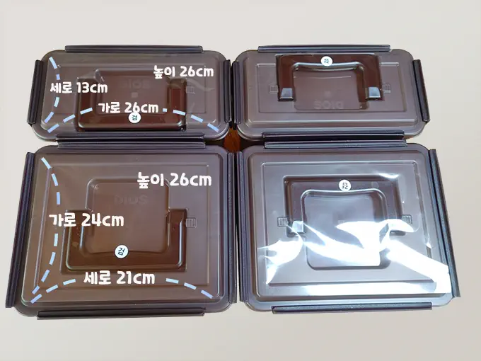 하단 1단 저장고에는 가로 24cm x 세로 21cm x 높이 26cm로 큰 사이즈 4개가 들어가고