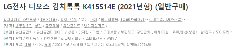 제품명: LG전자 디오스 김치톡톡 K415 S14 E (2021년형)