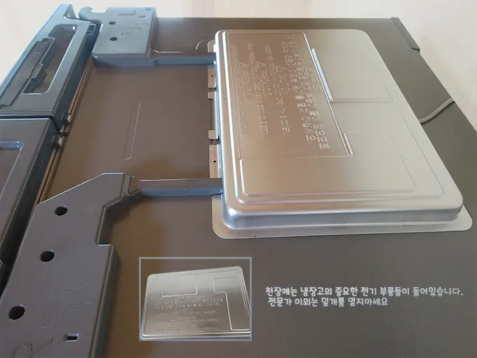 냉장고 상단에는 전기 부품들이 들어있습니다.