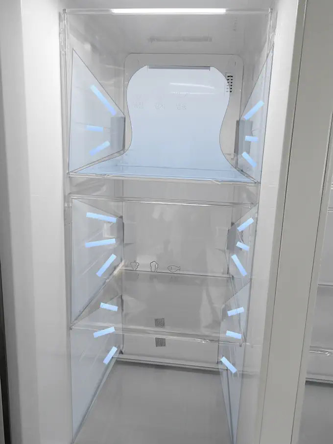 냉장고 내부를 비춰줄 led 실내등이 상단의 제일 앞쪽에 부착되어 습니다.