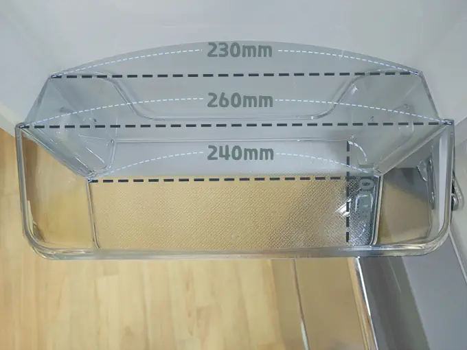 사용 용기에 따라 가로 최소 23cm ~ 26cm 세로 11cm 수납공간의 높이는 9.8cm 담을 수 있는 공간이 있습니다.