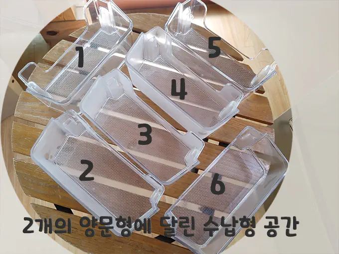 양문형 냉장고의 상단 공간엔 도어 한쪽당 1,2,3 개의 총 6개 용기가 기본으로 제공됩니다.