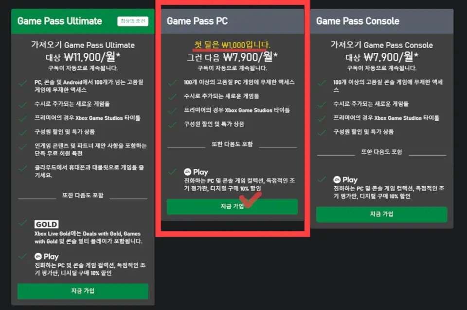 2. 가운데 첫달 1,000원 game pass pc 가입으로 눌러 진행합니다.