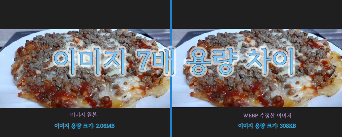 원본 JPG 유형을 WEBP 으로 변경함과 동시에 알파 퀄리티 "0" 설정으로 사진 원본과 WEBP 유형 파일로 변경 후 7배의 용량 차이를 보였습니다.